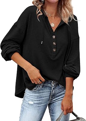 ASHER FASHION Womens V Neck Long Sleeve Henley Shirts Button Down Sweatshirts Hoodies Tunic Tops with Drawstring